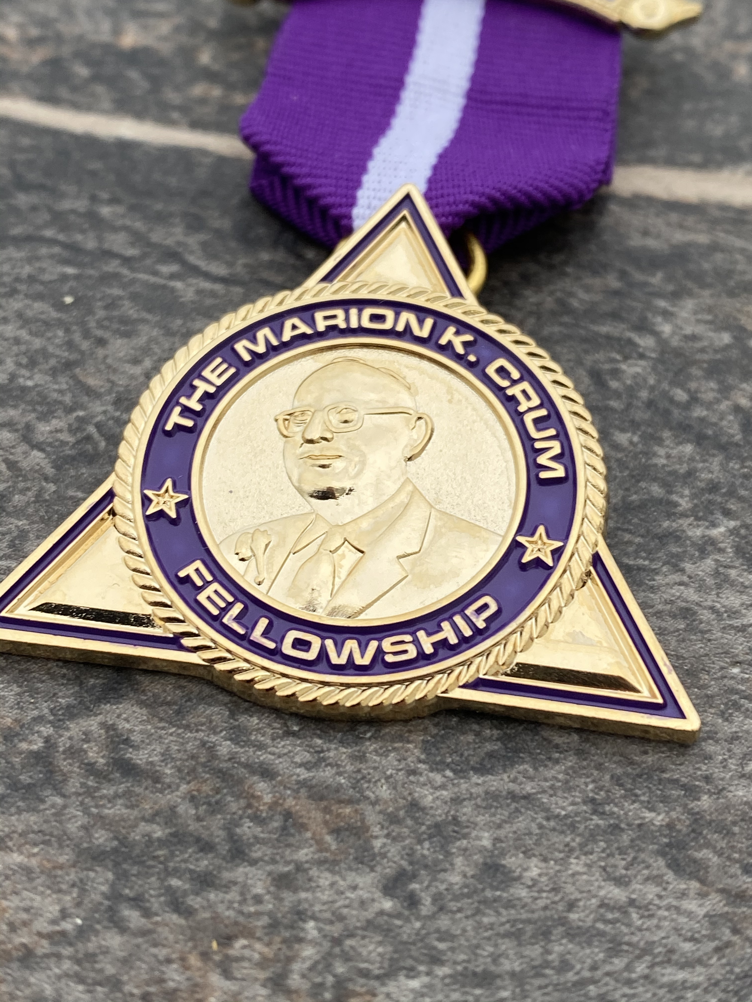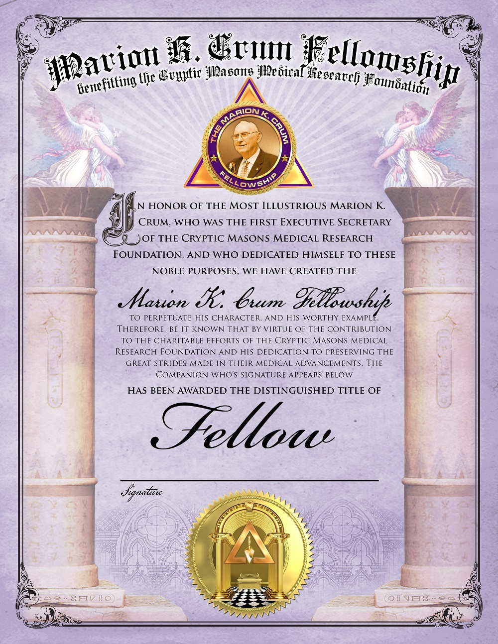 The Marion Crum Fellowship is an incentive to increase support for the C.M.M.R.F., and to honor one of the great pioneers in its creation. Marion Crum served as Most Illustrious Grand Master of the Grand Council of Indiana, and was the first Executive Secretary of the C.M.M.R.F., and is still active in Cryptic Masonry today! This exciting new program rewards the small donation of $100.00 with a stunning breast jewel, beautiful certificate and card.